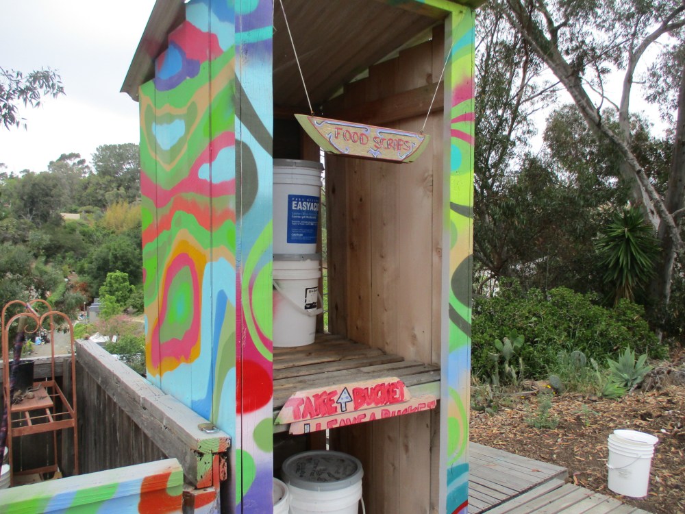The message is: Everyone, bring your compostable food scraps and grass clippings to the colorful structure you see in these photographs. The composting operation is located behind the Centro Cultural de la Raza at 2004 Park Boulevard. You can’t miss it!