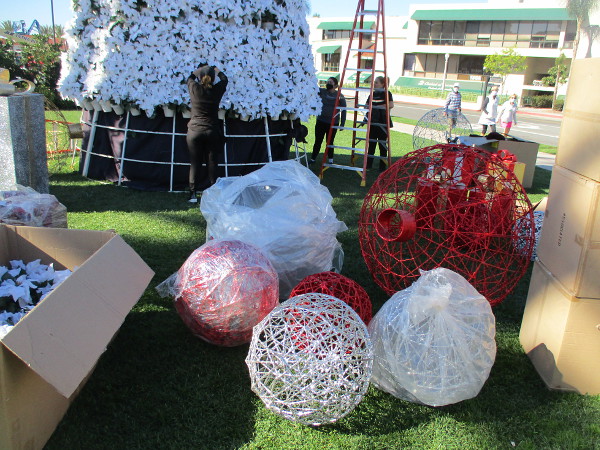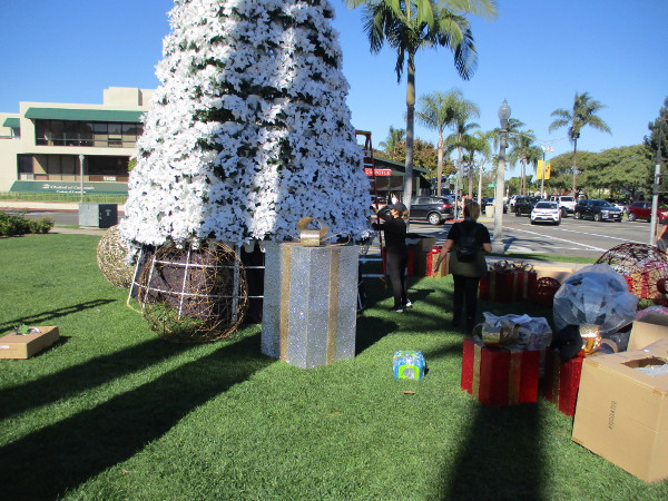 Workers using a ladder were busy getting the beautiful tree and other holiday decorations ready at the hotel’s grassy fountain plaza, which is located at the corner of Orange Avenue and RH Dana Place.