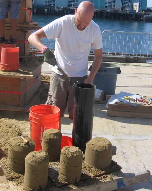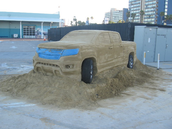 2014 US Sand Sculpting Challenge to be held downtown Labor Day weekend.Man shovels spilled sand on pier into one of many big piles.This artist is making a representation of San Diego’s skyline!Each mound will become a unique sand masterpiece.These guys are working on a life-sized sand truck!Carefully adding Chevrolet logo to back of the detailed sculpture.A few minutes later, an eagle is taking form on this heap of sand!
