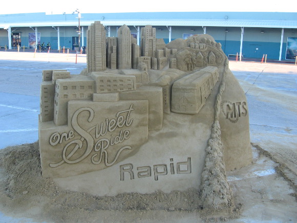It’s Chris Guinto, star of several shows on the Travel and Discovery Channels!While Chris gets to work, I walk to see finished sculptures created last Sunday.In my blog post from Sunday, you could see the eagle head being formed!The sand truck looks unfinished and rather odd to me.The San Diego skyline sculpture promotes new MTS Rapid bus route.Chris has a tripod up, and now I say good luck and head for the trolley.