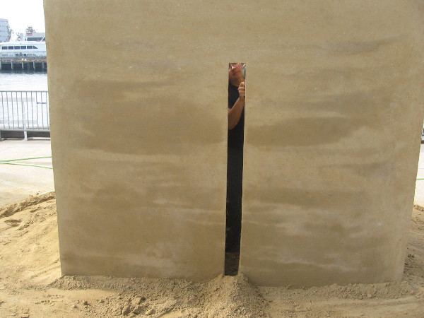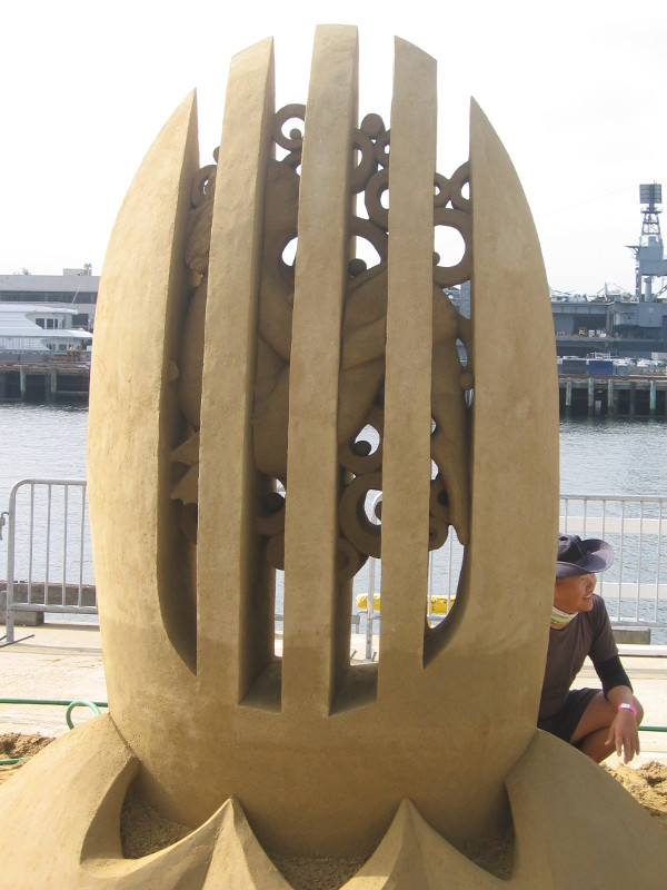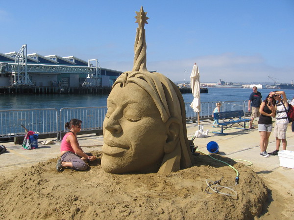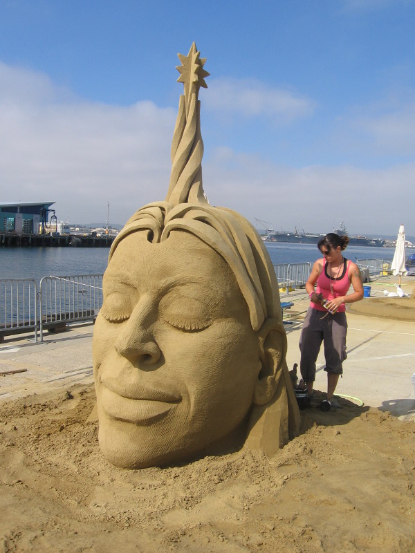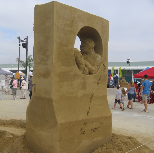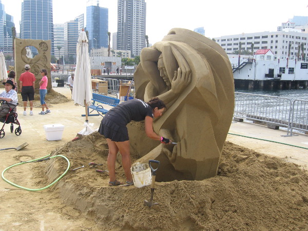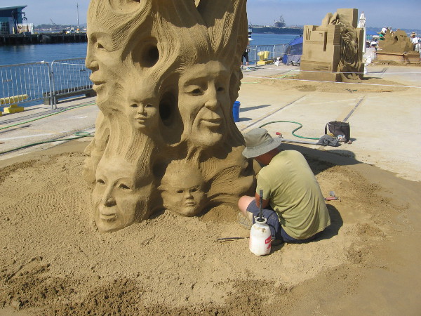 Chris Guinto concentrates as he carefully smooths an edge on his sculpture.Chris is married to a master sand sculptor who’s in the Guinness Book of World Records.An exotic, unusual creation seems to depict an ancient warrior.JOOheng Tan from Singapore is often called Vincent Sand Gogh!JOOheng Tan has won many top prizes around the world!What appears to be a simple piece is actually beyond astonishing…Look at the inside of the sculpture. Wow!Sue McGrew is a star on the rise and has won several important competitions.Where is Sue McGrew… She’s inside this strange sand box!The art is inside this hollow, angular sand sculpture!I guess you gotta peek through the slots to see the finished marvel!John Gowdy is a Jersey boy now living in Italy. He won Sand Wars on the Travel Channel.John Gowdy’s piece is both amazing and dramatic.Some people in a row boat are being upset by a hungry shark!The vibe of this sand sculpture is crazy good.Melineige Beauregard of Canada believes sand sculpting is a spiritual experience.This stylishly rendered human head radiates with warmth.Visible are the Broadway Pier and a few visitors to the US Sand Sculpting Challenge.Melineige’s work of art has a second figure hidden within the hair!Sandis Kondrats hails from Latvia! He won the Grand Prize at last year’s competition!Sandis Kondrats takes a break to check his smartphone.Very organic human heads are fused together in this fantastic creation.The world masters’ sand sculptures are lined up alongside San Diego Bay.Michela Ciappini from Italy is a frequent trophy winner here in San Diego.One side of Michela’s sculpture is very sparse, modern and geometric.But something is growing between those straight sand buildings.A huge sand rose and human form emerge on the other side!