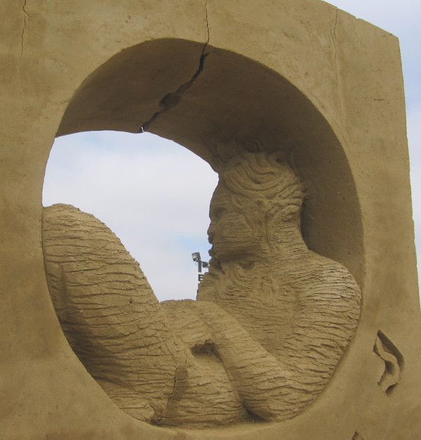 I noticed those sculptures that I took pictures of on Sunday are now completed. I also observed that the mounds of loose sand that the World Masters will sculpt this weekend have been enclosed in very mysterious-looking wooden frames.