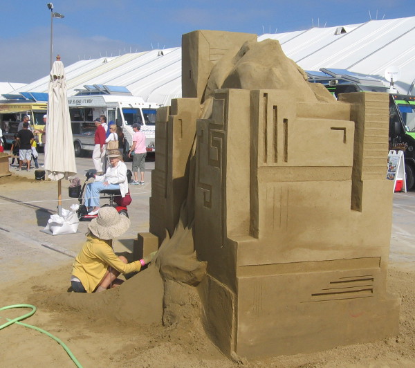 The fun event on the B Street Pier was sponsored in part by Chevrolet.Teams create fantastic sand sculptures out toward the end of the pier.Many displays of art dotted the exhibition, as well as food trucks and a stage.The teams began their sculpting on Saturday, the day of my visit.This funny dude sifting sand said he hadn’t found gold yet!Teams from far and wide get started on their wonderful creations.Some of the artwork you could enjoy was really sensational!I saw the Sandcastle Man at the Imperial Beach event, too!Now that’s about as advanced as I am–a pail and shovel!These sand heaps will be two demons cast into heaven by Buddha.MakerPlace was there demonstrating their creative local facility.What a beautiful Labor Day weekend by the bay on the Embarcadero!A close look at an artist sculpting with great care.Gazing back toward downtown, adjacent to the cruise ship terminal.The live entertainment hadn’t started yet early this morning.Another sponsor, Foster Farms, had their own very cool sand sculpture!