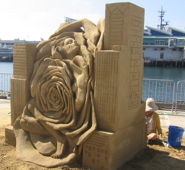 Kirk Rademaker is a Sand Master who has won 10 major international awards.Kirk Rademaker works on his shoe sand sculpture on San Diego’s B Street Pier.The master sand artists all work very carefully as big festival begins.Early Saturday morning, and the big Labor Day weekend crowd isn’t here yet.Joris Kivits from The Netherlands has won many awards in different countries.Joris Kivits works on an elegant, simply incredible work of art.2014 US Sand Sculpting Challenge is in San Diego by the cruise ship terminal.A close photo of some very fine work by a sand sculpting master.Helena Bangert, from The Netherlands, also does snow and ice sculpting!Helena Bangert steps back to look at her fantastic artwork on the Embarcadero.A lot of patience and steady-handed work is required to create each masterpiece.The skyline of downtown San Diego can be seen in the background.Chris Guinto has starred in three TV shows on the Travel and Discovery Channels!