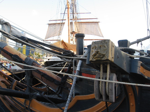 The sails of Star of India rise beyond one cathead of HMS Surprise.