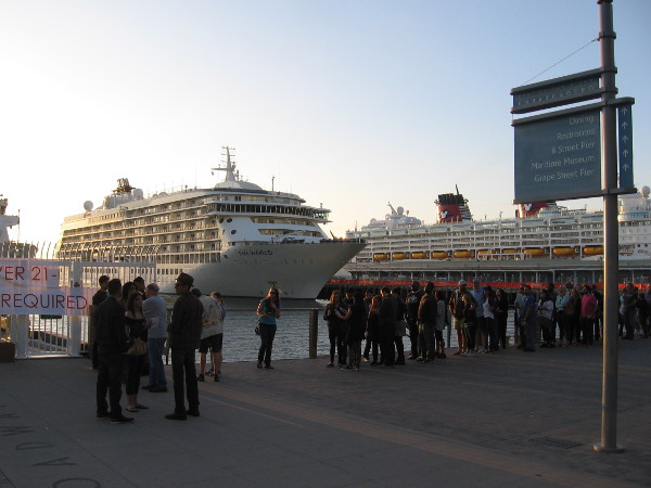 The World and the Disney Wonder at dock in San Diego.