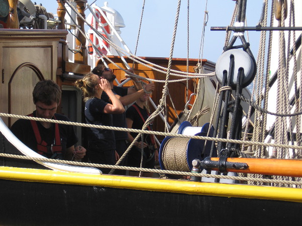 Crewmembers take to the ship’s rigging to do some work.