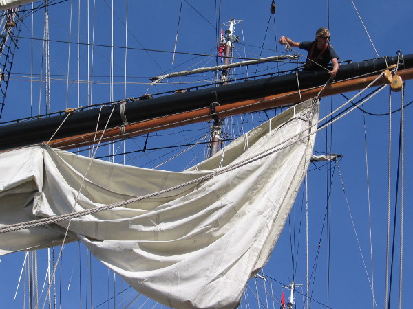 A wave from a crew member working high up on a yard of the beautiful three-masted Dutch clipper ship Stad Amsterdam.