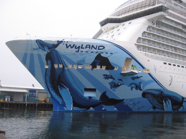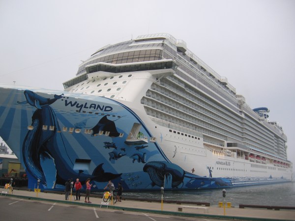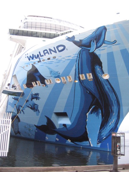 An amazing, gigantic mural by the renowned artist Wyland cruised into San Diego this morning! The mural, titled Cruising with the Whales, is painted on the bow of the positively enormous cruise ship Norwegian Bliss, which was diverted into San Diego due to Hurricane Willa off Mexico.