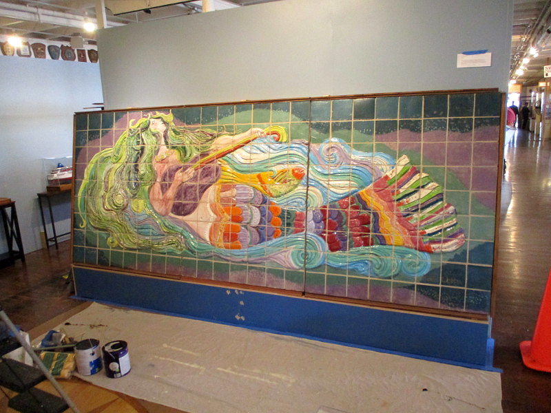 The thing that immediately caught my eye was the absolutely amazing work of art you see in the above photograph. I noted that the mural is titled Mermaid with Guitar. The ceramic and teak panel was created by artist Helen Webber in 1985 and decorated the Carnival Cruise Line ship MV Holiday. That ship was demolished in 2022 and the exceptionally beautiful mural was thankfully salvaged.