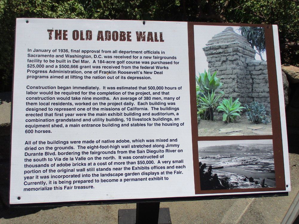 All of the buildings were made of native adobe, which was mixed and dried on the grounds. The eight-foot-high wall stretched along Jimmy Durante Boulevard, bordering the fairgrounds from the San Dieguito River on the south to Via de la Valle on the north. It was constructed of thousands of adobe bricks…A very small portion of the original wall still stands near the Exhibits offices…