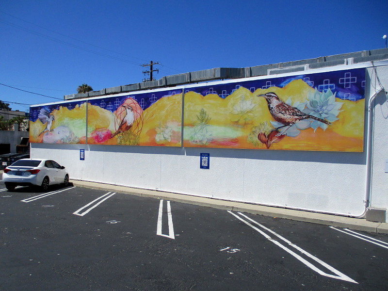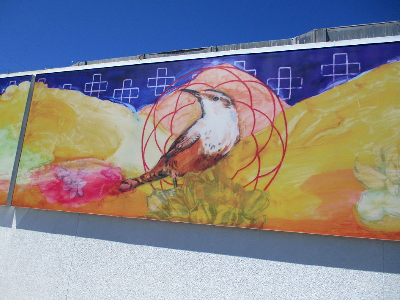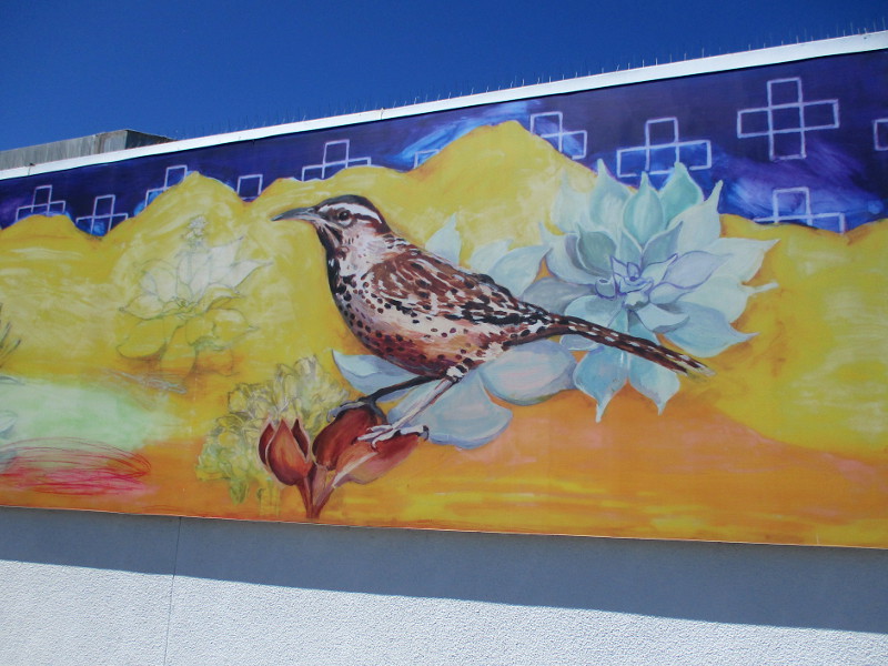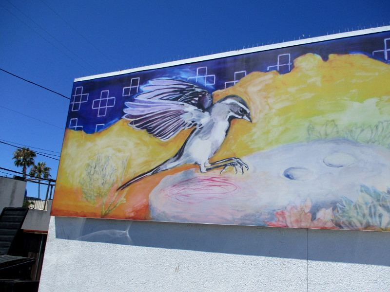A large, very beautiful mural in La Jolla shows three birds–a Black-throated Sparrow, a Rock Wren, and a Cactus Wren–in their native habitat. It’s titled Mukikmalim, Su’ulim, Chem-tema-ki’ay, which is in the Kupa language. It translates as Birds, Stars, Our Lands.