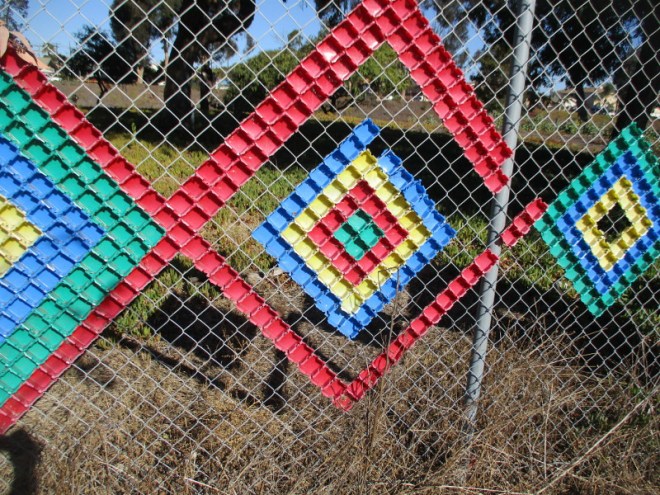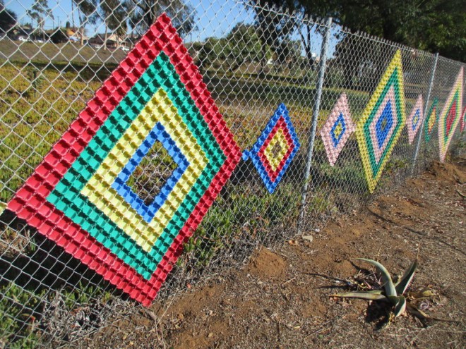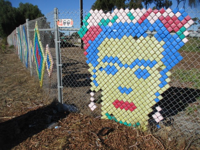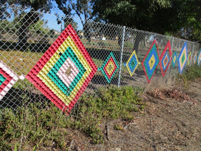 Colorful plastic squares had been applied to a chain link fence along Boston Avenue near Interstate 5. This artwork continues for several blocks! In addition to dozens of varied diamond patterns, I spied the above “portrait” of Frida Kahlo!