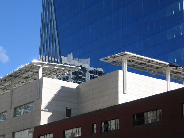 Just a cool photo of light and shadow and architectural geometry. The tall glass building is the new corporate headquarters of Sempra Energy in East Village.