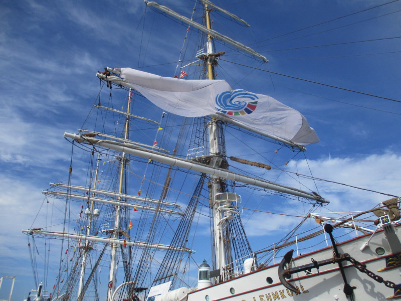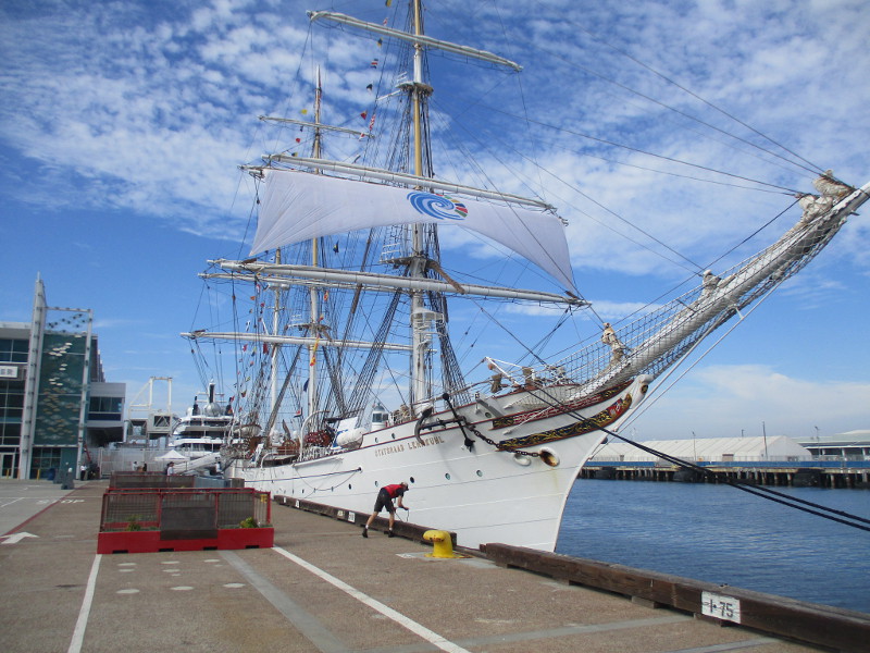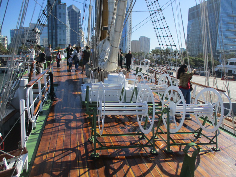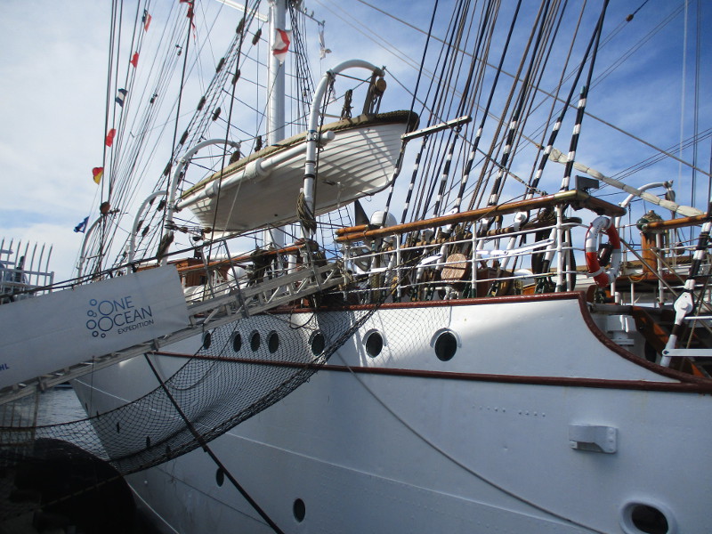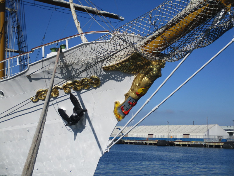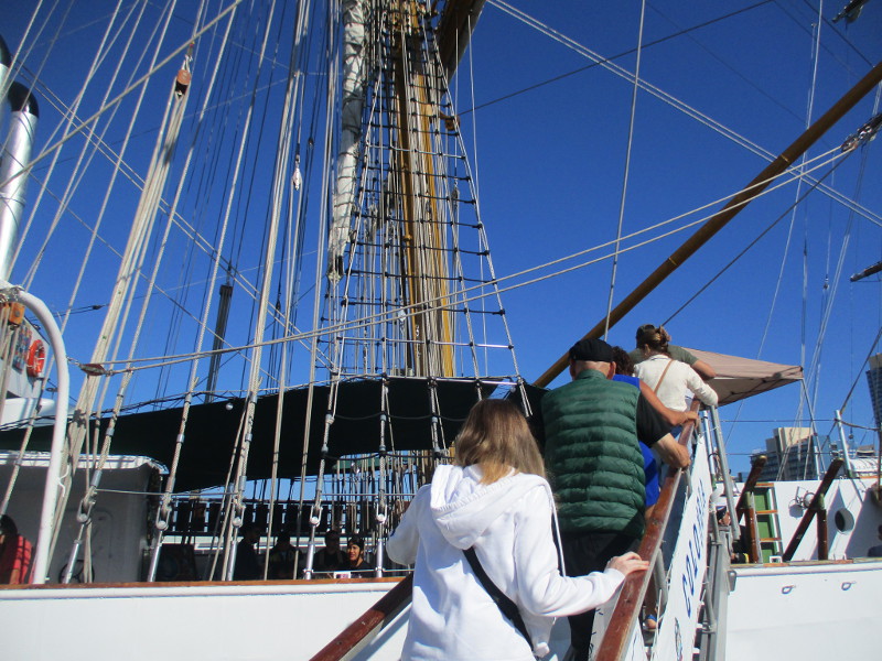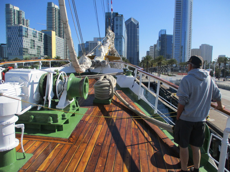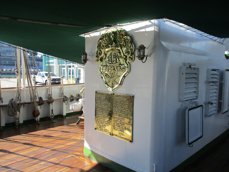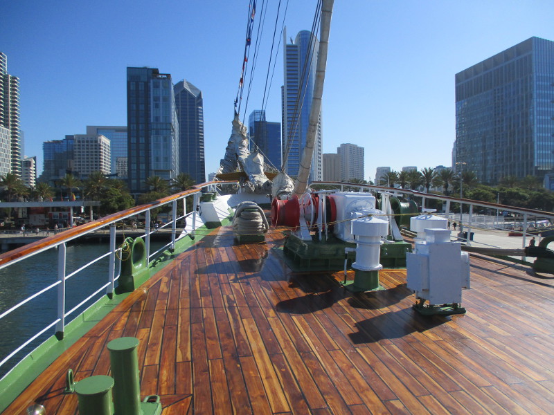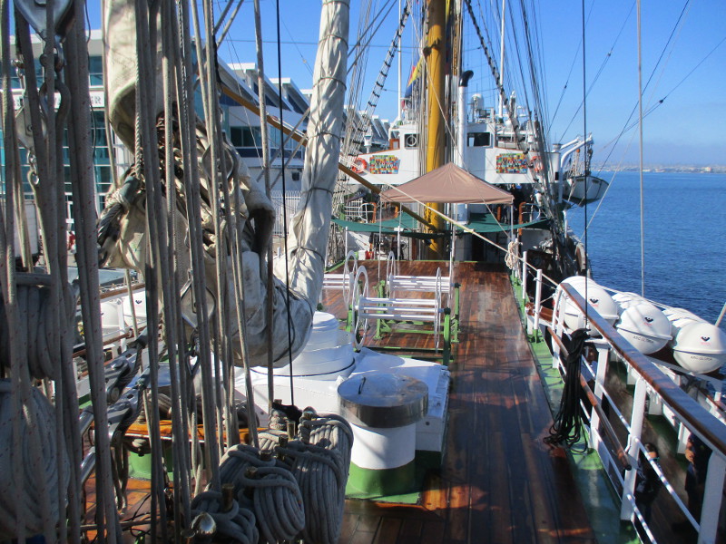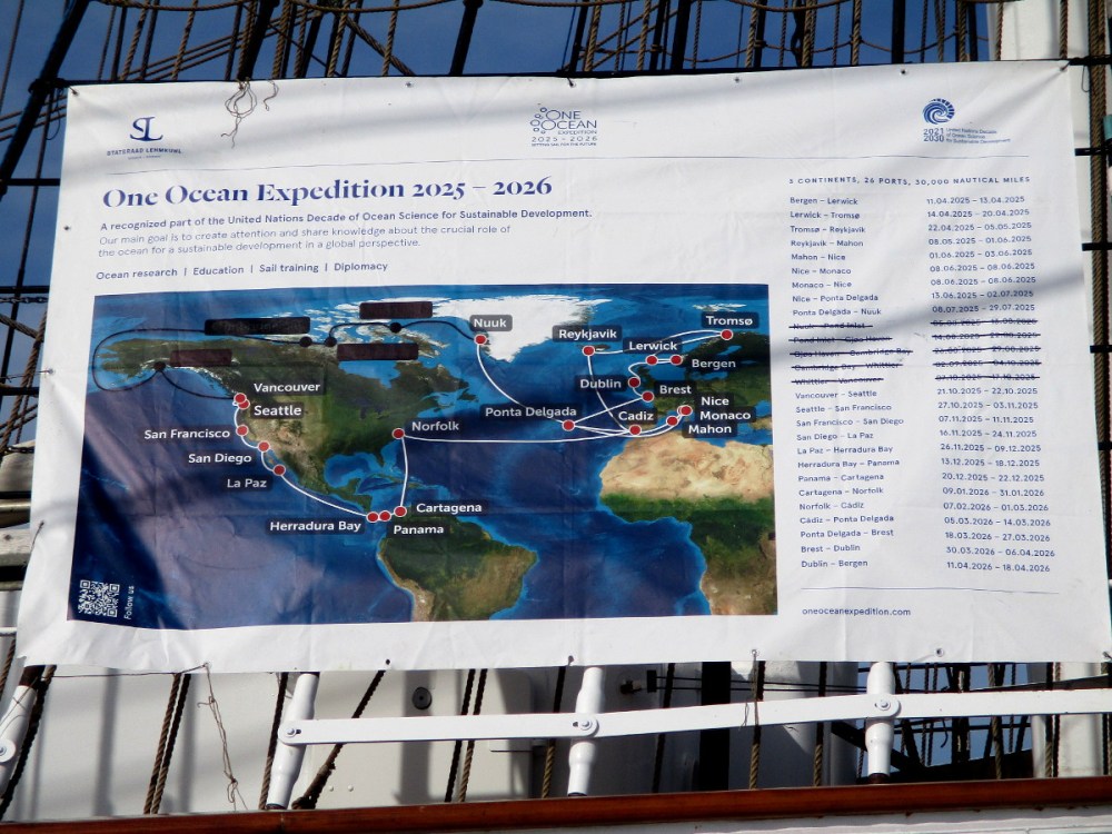 From San Diego it will sail down to Mexico, then Central and South America. According to a banner that I photographed, the Statsraad Lehmkuhl will visit a total of 26 ports on 3 continents, and travel 30,000 nautical miles!