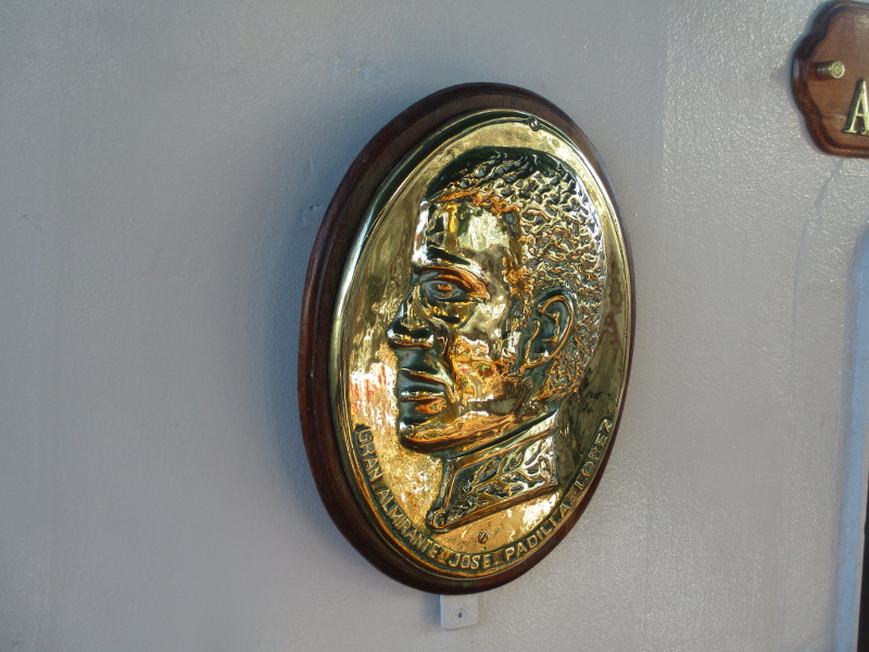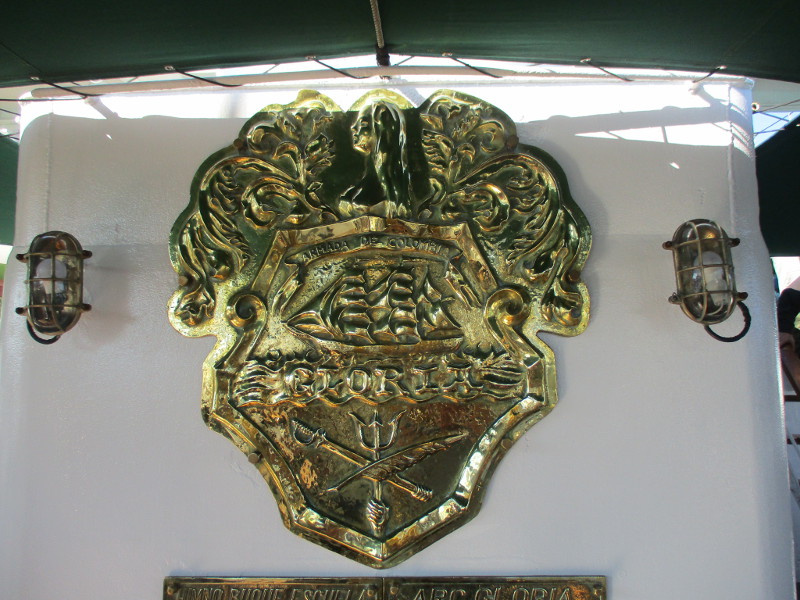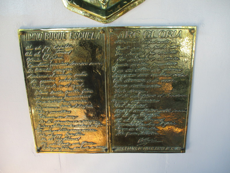 A shining plaque beneath the ship’s crest contains the words HIMNO BUQUE ESCULEA ARC GLORIA… MUSICA Y LETRA DE EVELIA PORTO DE MEJIA.