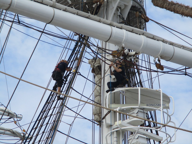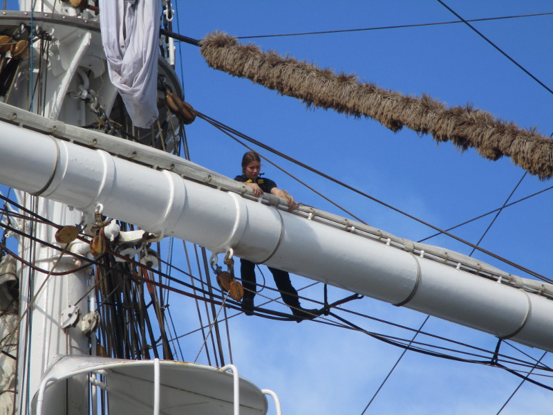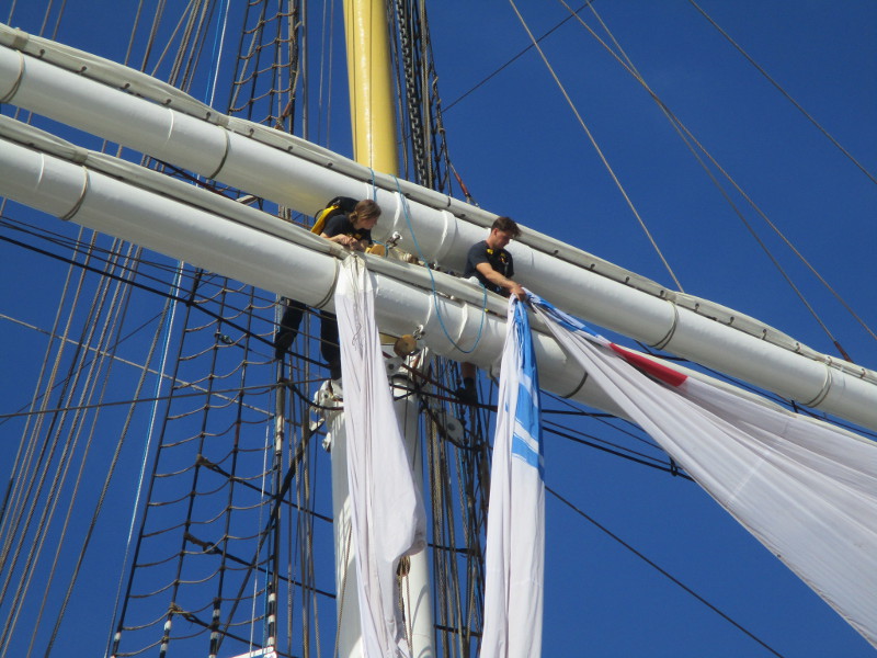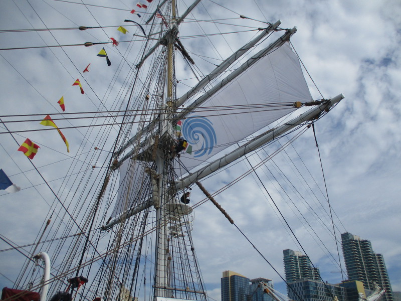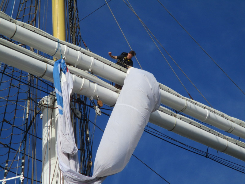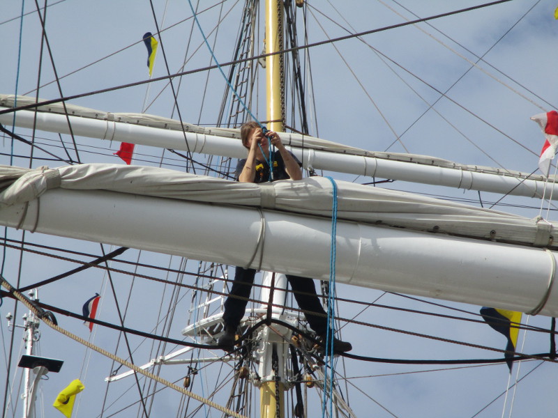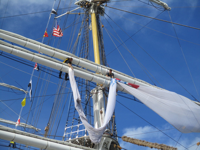 This morning, as I walked out on the pier, I noticed crew members high in the sky, preparing a huge banner that would hang like a sail from one of the ship’s yards. I sat down on a bench and watched the action! And took some photos!