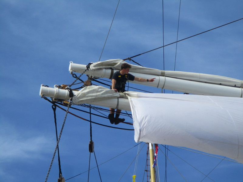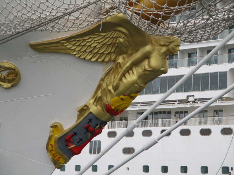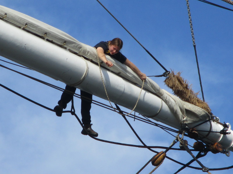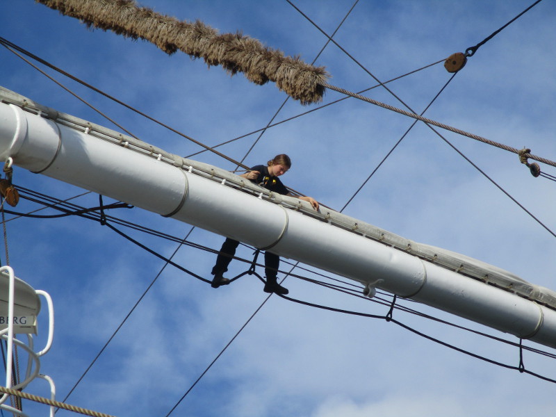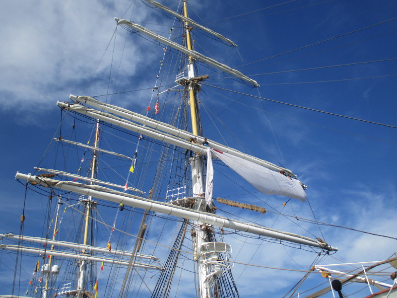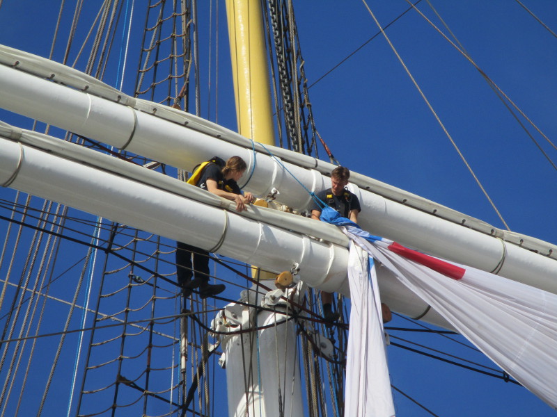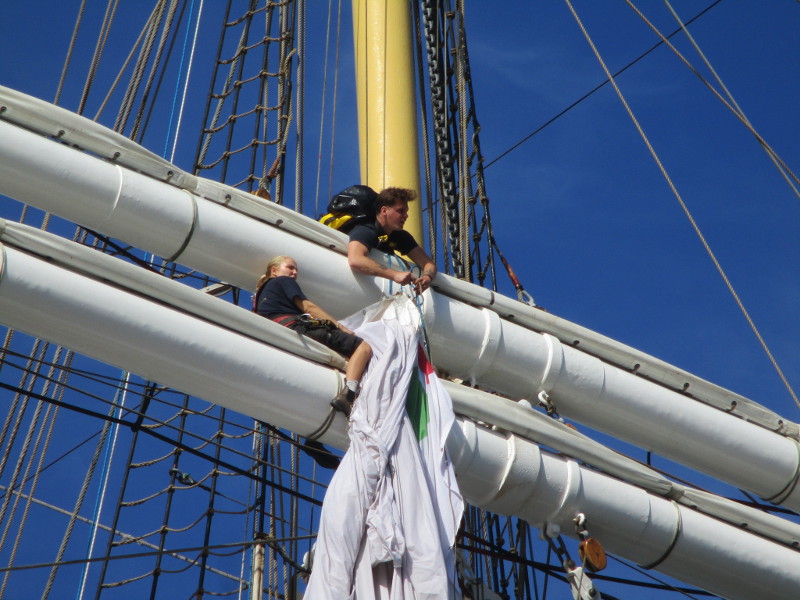 This morning, as I walked out on the pier, I noticed crew members high in the sky, preparing a huge banner that would hang like a sail from one of the ship’s yards. I sat down on a bench and watched the action! And took some photos!