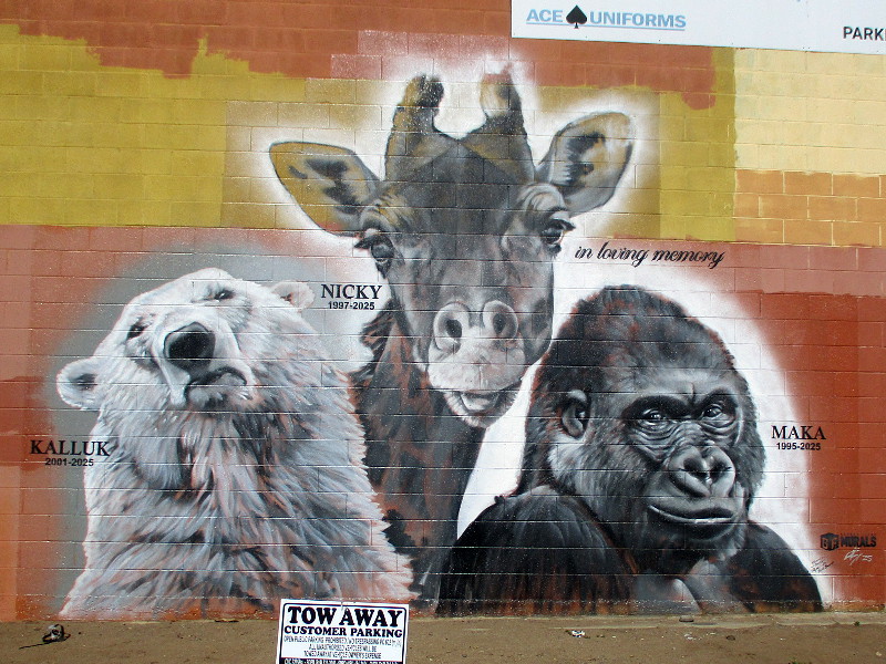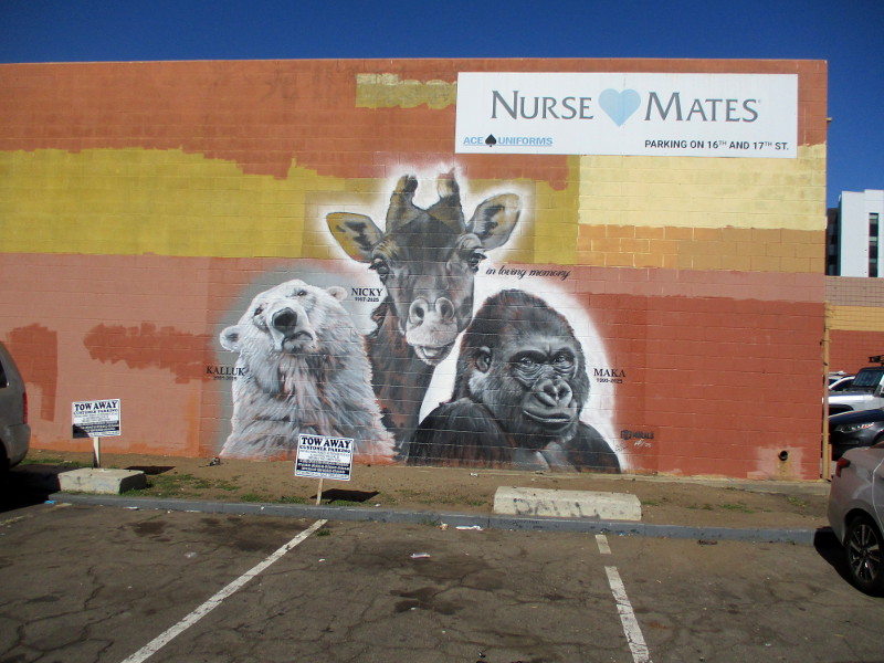 This beautiful mural was completed earlier this year in San Diego’s downtown East Village neighborhood. It memorializes three San Diego Zoo animals that passed away in 2025. It was painted by Ground Floor Murals.