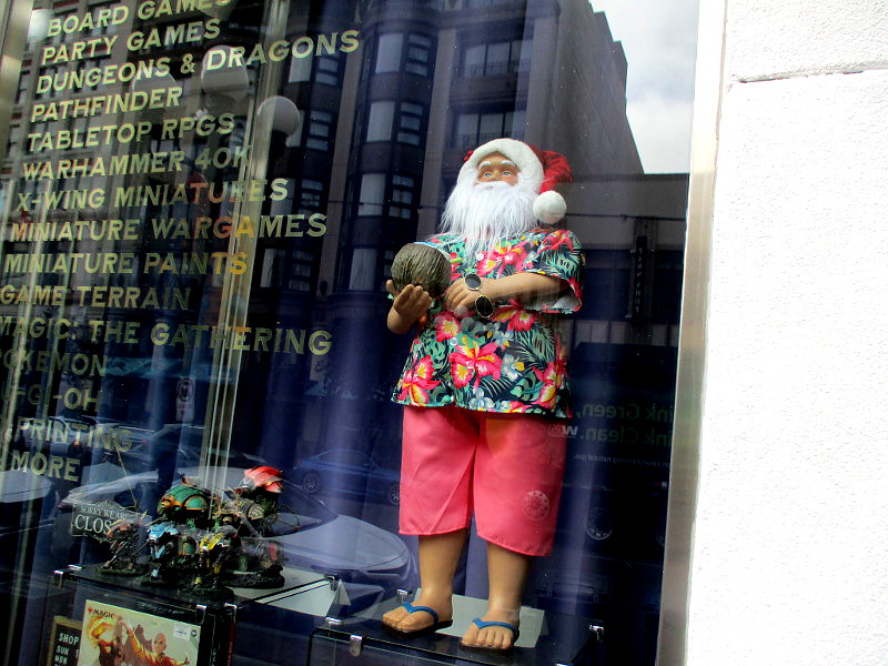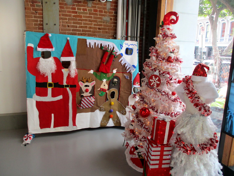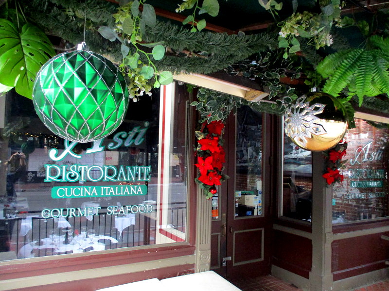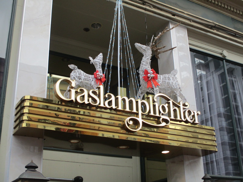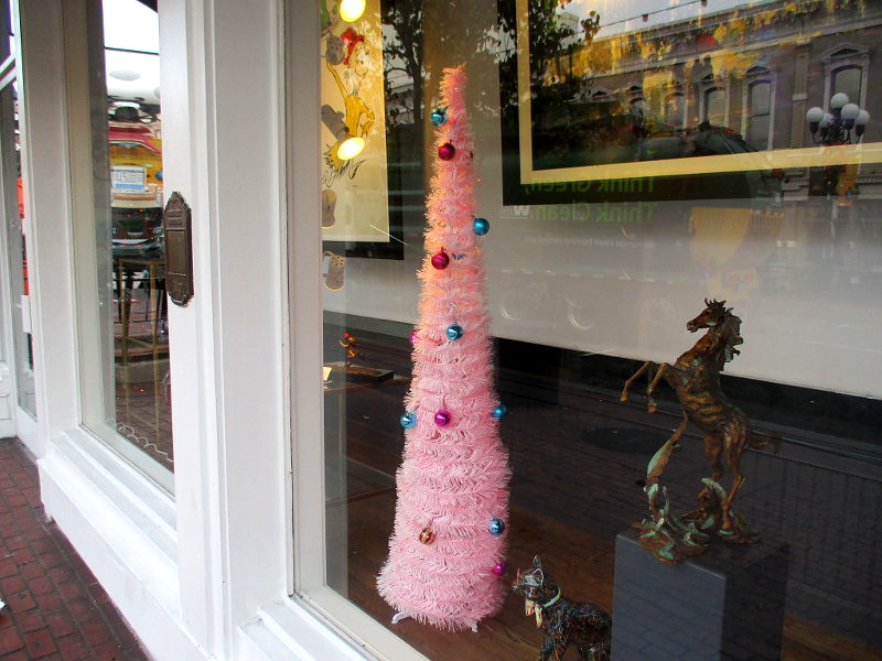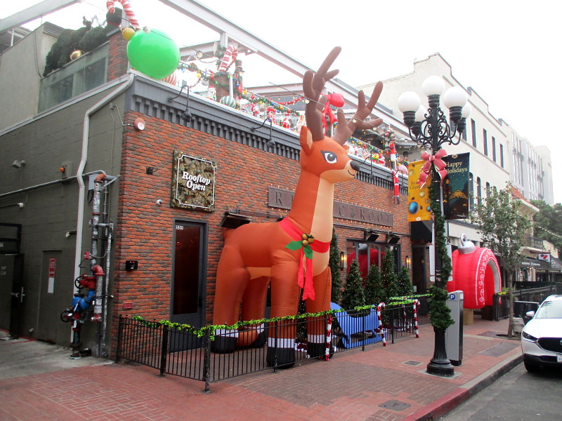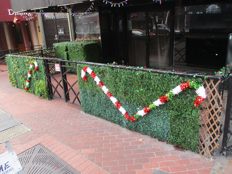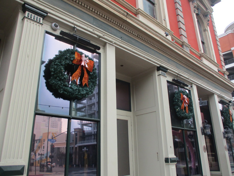 I took these this morning during a walk through the Gaslamp Quarter–mostly up Fifth Avenue. The Gaslamp trolley station was decorated, as were many restaurants, bars, hotels and store windows.