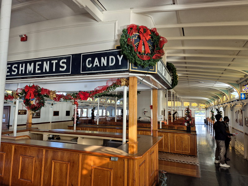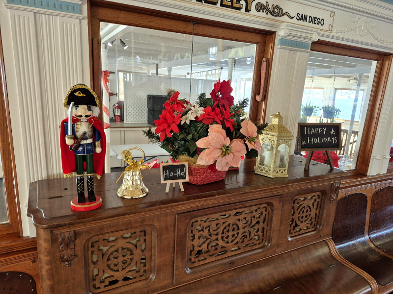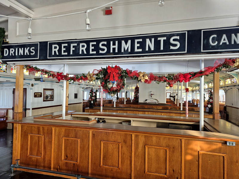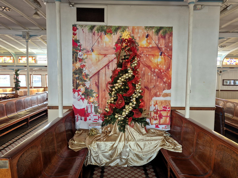 A beautiful Christmas tree sparkles in their gift shop, and the elegant passenger deck of historic steam ferry Berkeley appears even more amazing than usual. The handsome wooden benches bathed with the light from art glass windows now look upon green wreaths, red ribbons, and Christmas trees large and small!
