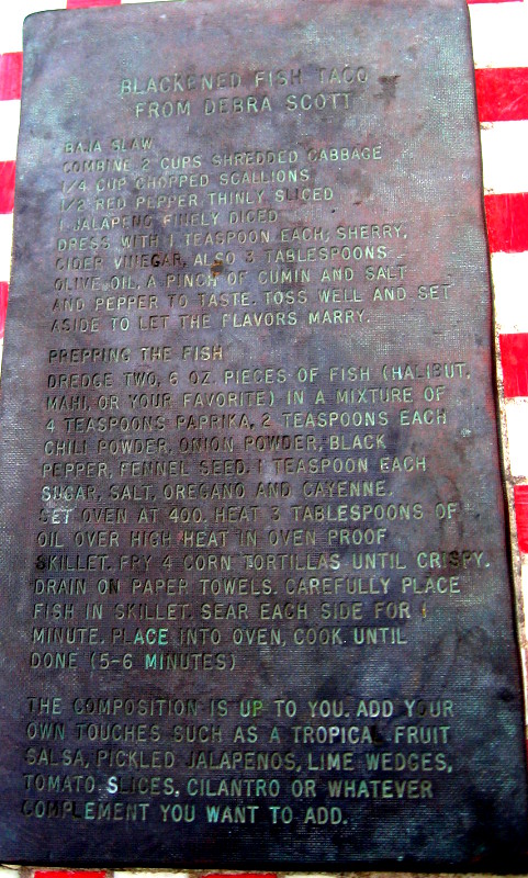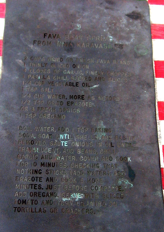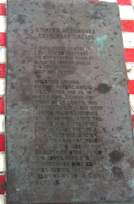 Metal sculpture of blackened fish taco plate in Little Italy’s unique Amici Park.Blackened fish taco recipe from Debra Scott.Food for thought is no substitute for the real thing. –Walt KellyYou’d need some powerful teeth to eat these stuffed artichokes!Stuffed artichokes recipe from Rose Cresci.Round plaque at Amici Park shows many popular spices.Marinara sauce on plate of tasty pasta makes fun public art!Marinara sauce recipe from local restaurateurs Lisa and Joe Busalacchi.Only the pure in heart can make a good soup. –Beethoven.A plate of fava beans served up on a checkered tablecloth makes for cool artwork.Fava bean spread recipe from Nina Karavasiles.A Recipe For Friendship celebrates food, created by Nina Karvasiles in 2001.