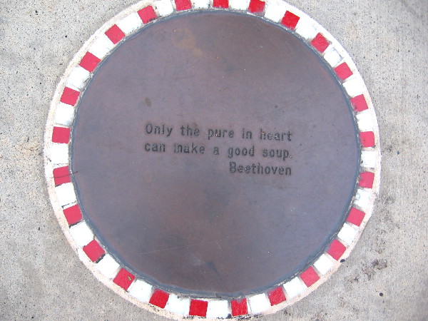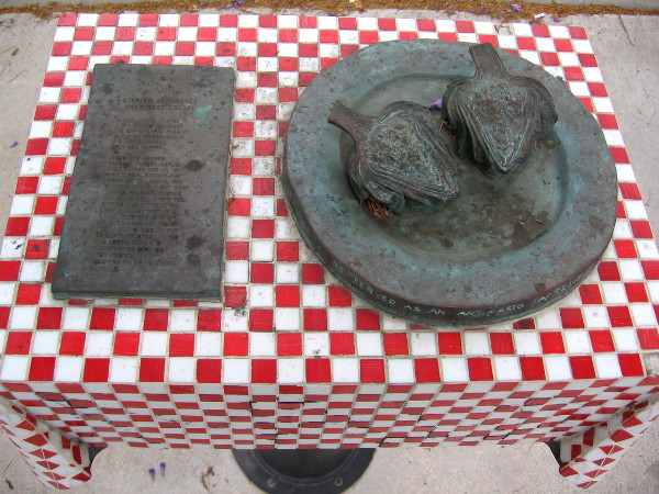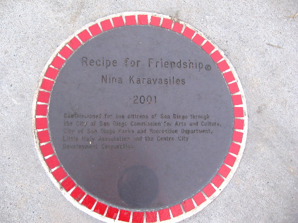 The red and white checkered tablecloths you see are actually glass mosaics. The recipes beside the plates are designed so that inquisitive gourmets can take a rubbing, and bring the recipe home. The various round plaques are sprinkled about the park, set in concrete where people might walk. The entire installation is called “A Recipe For Friendship” and was created by Nina Karavasiles in 2001. The public art was commissioned by the City of San Diego Commission For Arts and Culture.