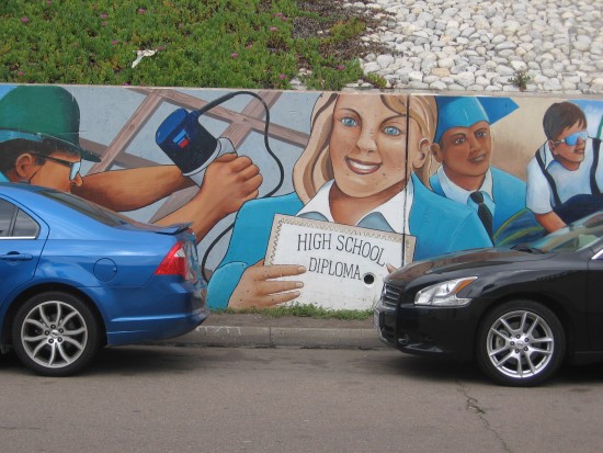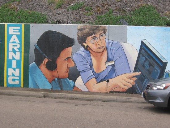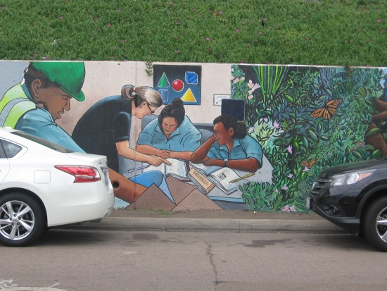 Mural depicts youth bettering San Diego’s environment.Urban Corps provides valuable employment training.Eliminating graffiti is one important activity.Youth have a second chance to earn a high school diploma.Urban Corps mural shows conservation efforts.Education is the key to moving forward to success.Young people have an opportunity to earn a paycheck.Segment of Urban Corps mural near Rosecrans and Jefferson.Optimism and opportunity on a long, colorful mural.