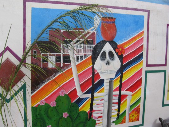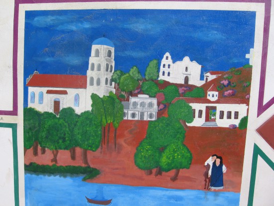 I was wandering aimlessly around Old Town some time ago, just poking my nose here and there, when I discovered a whole bunch of beautiful murals! I found them in an interesting alley off San Diego Avenue, just south of the State Historic Park. The alley, a narrow walkway containing a variety of touristy wares, is called Avila Court. It’s tucked between the Old Town Surf Co. and Covered Wagon stores.