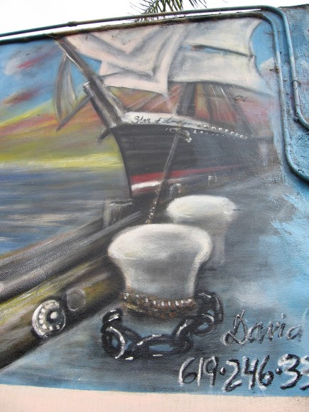 Native American with flower at night painted in rich colors.Hotel del Coronado, buildings and beach scene.Day of the Dead skeleton in front of the Whaley House.Tuna fishermen and whale fluke off Coronado.Navy ship, huge surf and Mission San Diego.Mural shows an American tall ship in San Diego Bay.