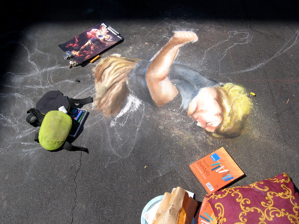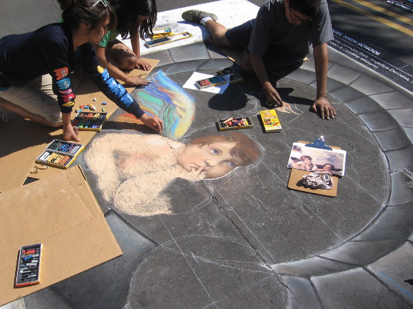 Washington Elementary STEAM students attend school just up the street.This Italian chalk art will be admired by tens of thousands on Sunday.Roosevelt I.B. Middle School students work on a scene that includes a gondola.The many chalk artists usually use existing images as a guide.Gesso Italiano chalk art is extremely bold, bright and colorful.Santa Fe Christian High School students were creating some fun, inspired art!Grant Pecoff has a studio in Little Italy. His original artwork is being duplicated.Torrey Pines High School National Art Honor Society student works on asphalt canvas.Platt College had partially completed this, but no one was present when I walked past.13 year old Lidia F. Vasquez has been creating stunning chalk art for 4 years!Here’s what Lidia is working from. She attends High Tech Middle School.And this is the super cool, mind-blowing masterpiece young Lidia is producing. Wow!Teresa Elliot is almost finished with this abstract many-colored human face.The Mount Miguel High School design appears to contain a cherub with rainbow wings.Very talented young people are hard at work on a sunny day in San Diego.Team from Cathedral Catholic High School works to create some elaborate art.Chalk outlines of human figures that are slowly taking form.Torrey Hills Elementary kids are making something Italian that looks tasty!San Pasqual High School still has a bit or work to do. I can’t wait to see it finished!Lincoln Acres Art Program is creating a cool Mona Lisa optical illusion with chalk!I could take photos of this incredible stuff all day!One block of Date Street at Festa is dedicated to school students and their art!