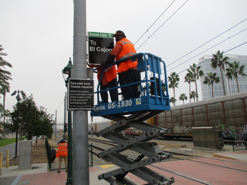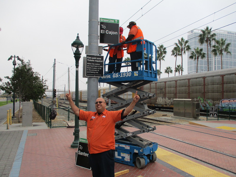 I happened to be walking through downtown San Diego’s Gaslamp trolley station this morning when I spied these workers replacing some signs. The old signs on this side of the tracks indicated To Santee. The new signs tell passengers the Green Line will now end at El Cajon!