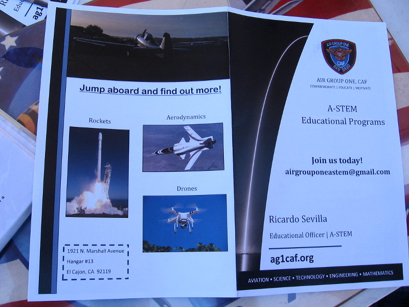 Banner promotes Air Group One’s Aviation Educational Programs.Air Group One’s historic 1943 SNJ-5 “Sassy” on the tarmac at Gillespie Field.Flyer describes an exciting ASTEM educational program offered by Air Group One.If you’re interested, use the email shown in this photograph.Learning about aviation can help a student take flight and discover new horizons!