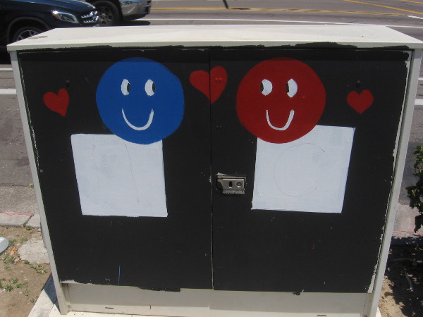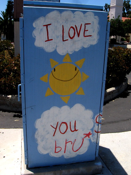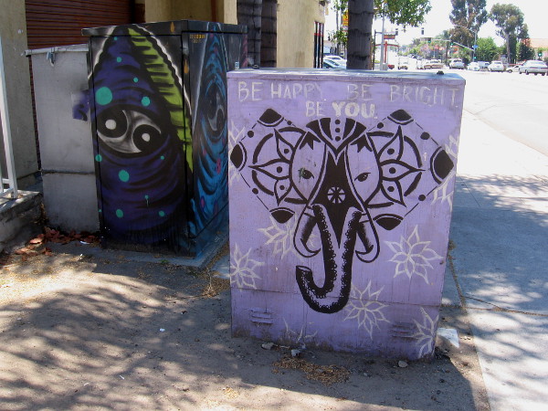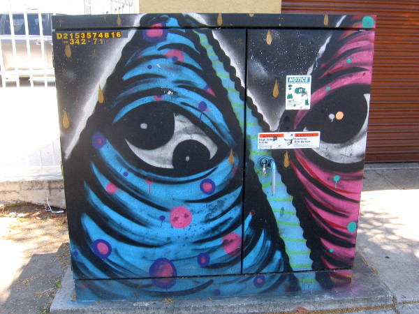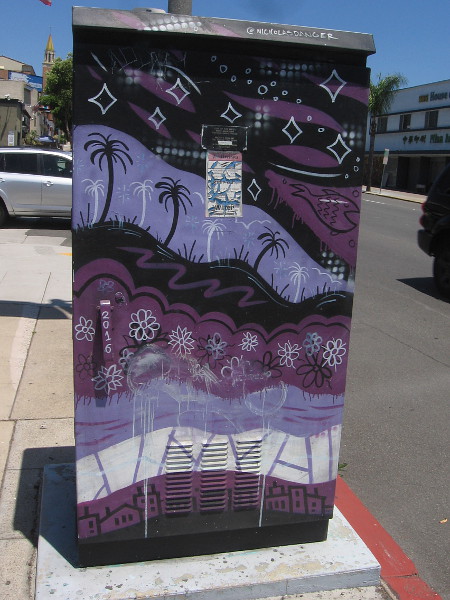 I was walking along El Cajon Boulevard just east of 54th Street–part of the El Cerrito neighborhood–when I noticed lots of fun street art painted on electrical boxes.