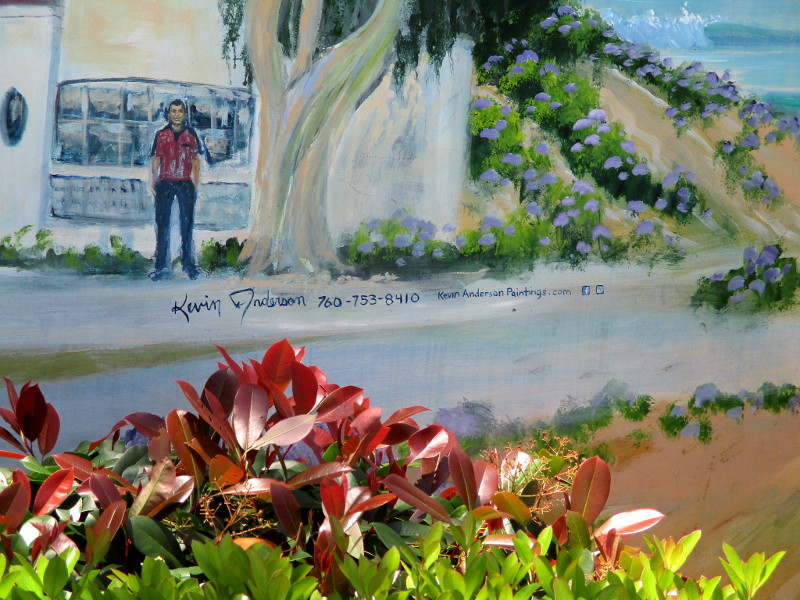 The mural, celebrating Encinitas and some of its landmarks, was painted by Kevin Anderson. The artwork is set back from the Coast Highway, behind the 7-Eleven store and its gas pumps. It’s easy to miss.
