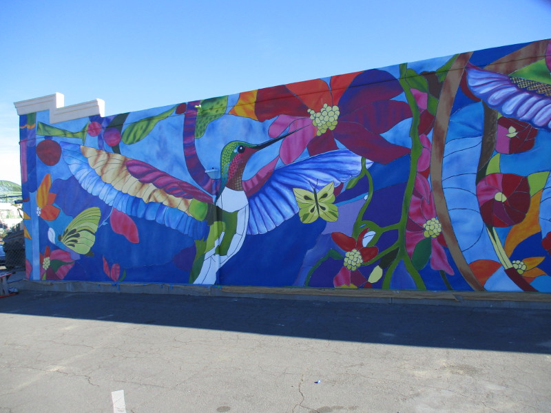 An absolutely amazing mural is being painted in Escondido. It’s on the side of a building at Maple Street Plaza, and appears to be almost completed. I spotted the new mural behind a fence today as I walked down Grand Avenue. Information posted on the fence tells the story of this colorful artwork, which is titled Hummingbird Jubilee!