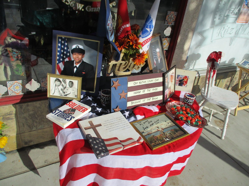 A few preliminary photographs were taken as I walked down Grand Avenue waiting for the parade to begin. Several downtown Escondido buildings and storefronts were decorated with patriotic red, white and blue for Veterans Day.