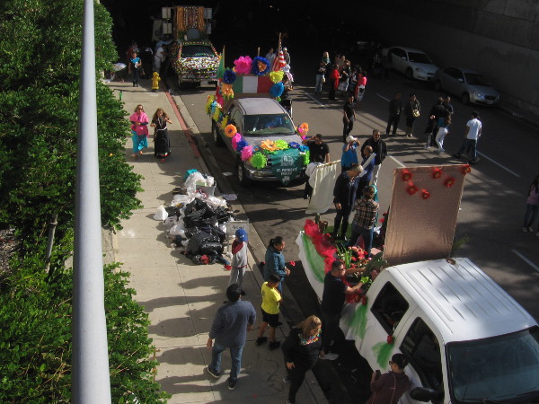 I took some photos as people busily prepared each parish float, attaching religious banners, flowers, flags, and a special spot where a young lady would pose as a statue of Our Lady of Guadalupe.