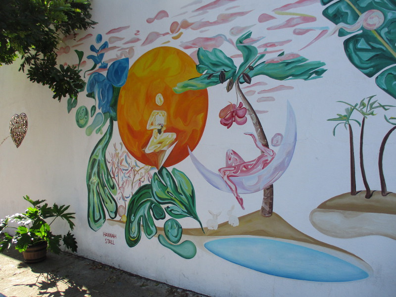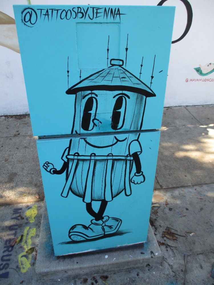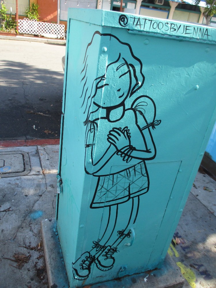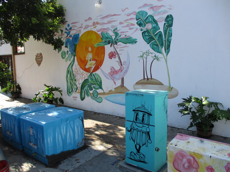 I photographed different dreamlike street art on this San Diego corner almost seven years ago. The group of electrical boxes has been decorated for as long as I can remember. Some of the past artwork was nightmarish. See those old photos here.
