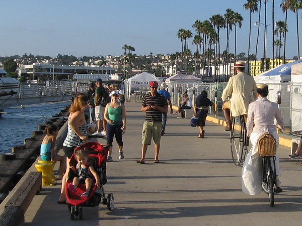 The Port of San Diego and the Maritime Museum are presenting the 2015 Festival of Sail, with lots of cool visiting tall ships, cannon battles, and other nautical stuff.Photographer near the HMS Surprise takes a photo of masts along the waterfront. Many tall ships are docked just beyond the museum’s Steam Ferry Berkeley.I saw a number of people wearing old-fashioned costumes, including these folks riding a bike and a big-wheeled penny-farthing along the water!Members of the United States Navy came jogging down the Embarcadero as the day came to an end in San Diego!The sun descends behind clouds. Many high masts, yards, ropes and fluttering banners add character to beautiful San Diego Bay at the Festival of Sail.Two crew members work high in the rigging of the Amazing Grace tall ship.The 2015 Festival Sail runs through Labor Day weekend. You’ll find it downtown at the awesome Maritime Museum of San Diego!