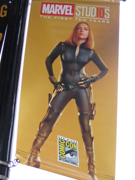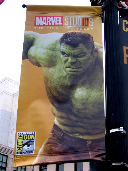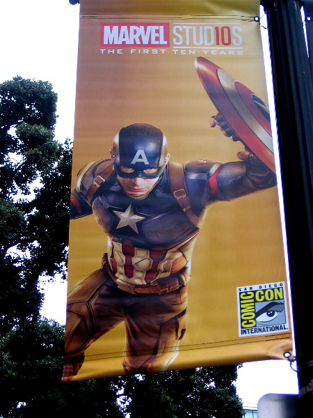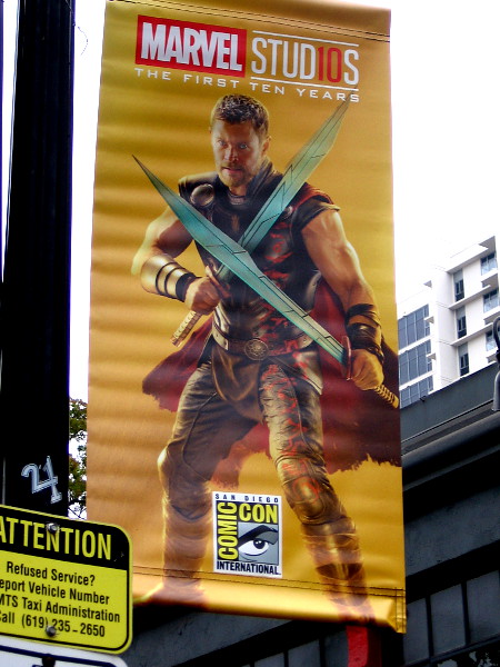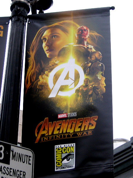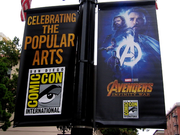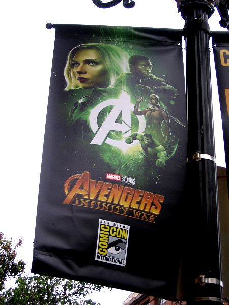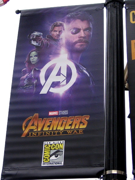 Cool banners that celebrate Marvel’s Infinity War films and Marvel Studio’s first ten years have been hung in the Gaslamp Quarter for 2018 San Diego Comic-Con! There are several different colorful designs featuring lots of popular characters, including members of the Avengers and the Guardians of the Galaxy. Check them out!