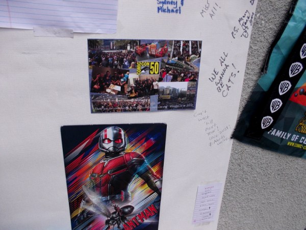 I was walking by the Gaslamp trolley station a couple hours ago when I noticed a shrine has been created in the plaza near the Tin Fish Restaurant. Fans know that this area, at the south end of the Gaslamp Quarter’s Fifth Avenue, tends to be center of all the crazy, wonderful outdoor Comic-Con activity. At least, it is during normal years.