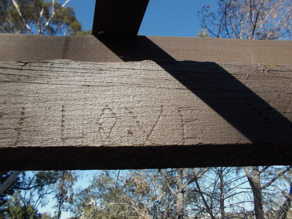 LOVE carved into the beam of a wooden shelter on Presidio Hill.