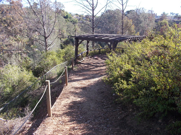 The trail, among quiet trees, climbs above the location of the old Spanish presidio, the nearly 250 year old birthplace of European civilization in California. After a short distance, the trail descends toward a primitive wooden shelter overlooking a canyon.