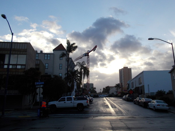 Looking east from Kettner Boulevard in downtown San Diego’s beautiful Little Italy neighborhood. Morning clouds catch the rising sun after some nighttime sprinkles.Little Italy streets have many public planters filled with flowers. Orange blooms in this hanging planter are still wet from the recent rain.Many spring flowers provide a burst of color near the windows of a Little Italy restaurant.A small patch of color on India Street. A nearby sign reads Garden by Randall.Some moisture has pooled in the leaves of this potted geranium on the sidewalk.More happy flowers by the outdoor seating area of a restaurant. The clear plastic that provides protection from inclement weather is still wet with many raindrops.Bunches of hanging flowers. Gorgeous spring colors are all about Little Italy’s friendly streets.Banner on a street lamp advertises the upcoming Mission Federal Art Walk in Little Italy. It’s about a month away.Some yellow blooms on a small table in the front patio of a Little Italy residence.An eye-catching bird of paradise flower greets anyone who approaches this door!Walking with the dog up a sidewalk in Little Italy, early one spring morning after some rainfall.A peek through a window at flowers on a table inside a Little Italy breakfast spot.To see lots of bright flowers on San Diego’s streets, perhaps swing by Little Italy during the spring!