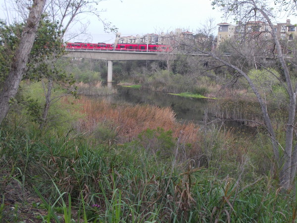 Gazing west along the San Diego River from Qualcomm Way.Bicycle and pedestrian paths follow the San Diego River through Mission Valley.Litter carelessly dropped near a mile marker for The San Diego River Trail. It was picked up.The community is working to restore and enhance this area while making an inviting living science center in the heart of our urban riparian environment. (Click image to enlarge.)Make a difference with a fun group of people. Join the River Assessment Team! Help support a clean river and get some exercise! (Click image to enlarge.)A red San Diego Trolley passes over the life-filled river as it approaches the Rio Vista station.A gathering of American coots (or mud hens) where the San Diego River passes beneath Camino del Este.Dark clouds and barren Fremont Cottonwoods minutes before a winter storm brings brief torrential rain.Beautiful flowers can be seen at almost any time of year during a nature walk along The San Diego River Trail.A couple of busy bees collect pollen in the morning.