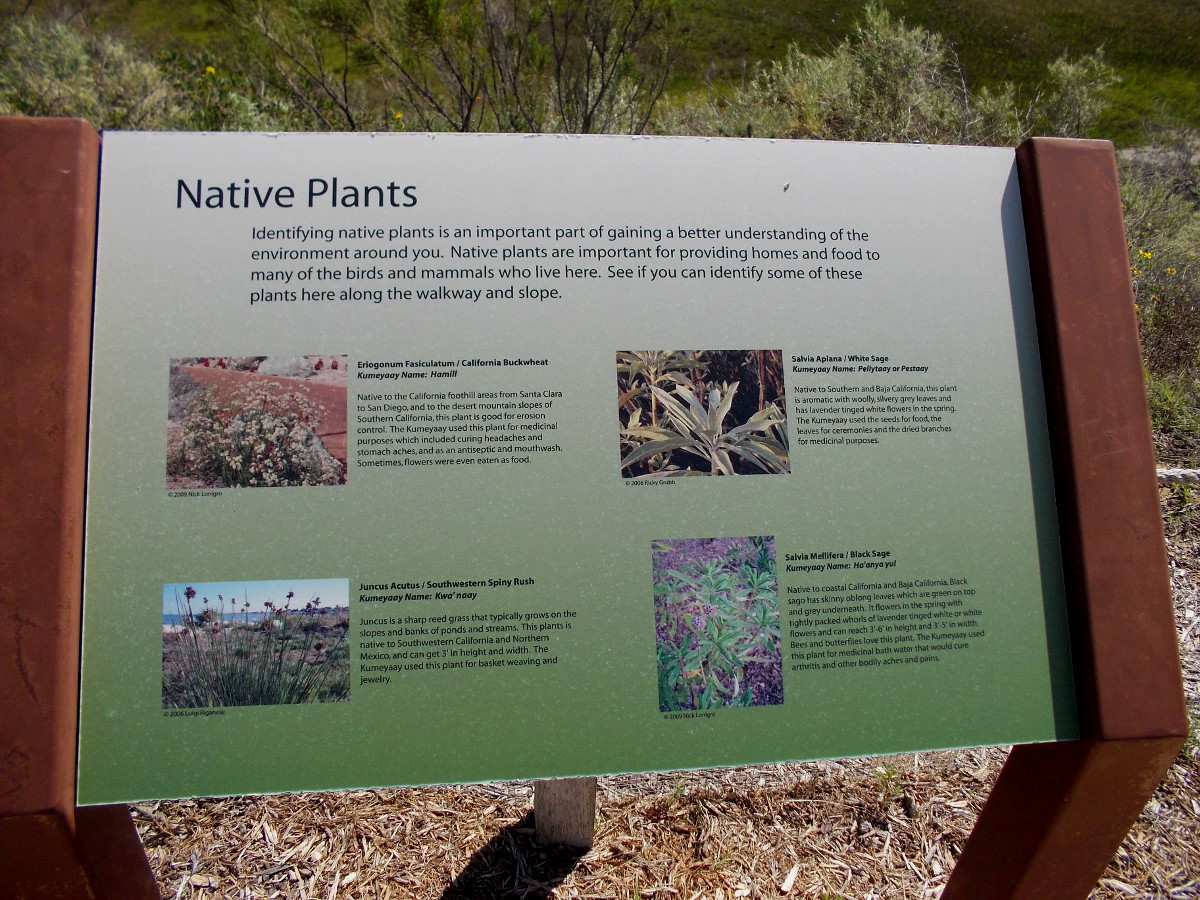 Information sign near edge of estuary identifies native plants. California Buckwheat, White Sage, Southwestern Spiny Rush, and Black Sage.View of National City wetland from observation area south of the Best Western Marina Gateway hotel parking lot.Beginning down the footpath on a sunny weekend day.Some eroded sandstone adds beauty to the scene.Prickly pear and chaparral yucca above a green estuary.Beyond the sign lies a fragile wetland where native plants and animals are protected. I saw some birds out in the wildlife refuge.I turned about after a short hike and headed on back to the hotel parking lot.