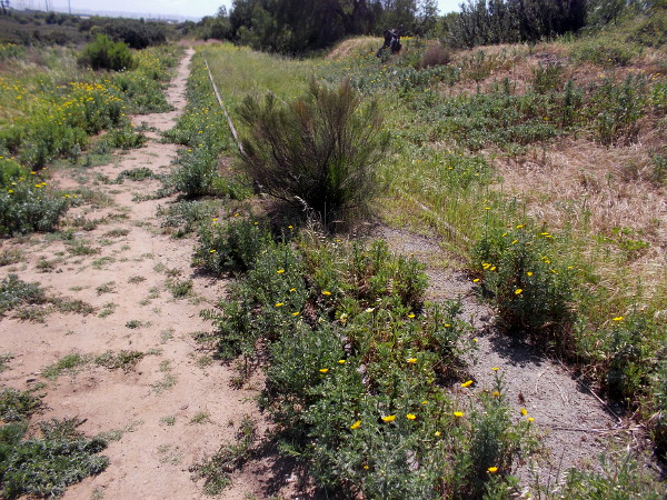 Rusty old train tracks are overgrown with wild vegetation, including many California bush sunflowers.