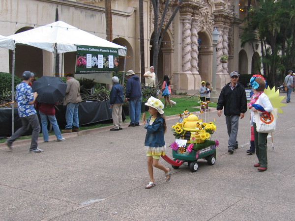 Here comes the Floral Wagon Parade down El Prado. Lots of colorful blooms have been arranged to delight onlookers!An elaborate Friends of Balboa Park display near the front of the parade. Today was the park’s Second Annual Garden Party!Here comes more of the morning parade! The Garden Party was just getting underway at nine o’clock, and the later crowds hadn’t quite materialized yet.This cool musician was playing Somewhere Over the Rainbow on a ukulele!Towed by young people, floral displays head down Balboa Park’s central El Prado.Even though the sky was gray and overcast, these flowers brightened the day like small suns.A terrible disaster! A basket-trailer containing fruit overturned during the parade!Here comes Botany for Kids! (It seems the adults were having the most fun.)These young ladies informed me that they were dressed as garden fairies.Is that a digital Sheldon Cooper on the screen? No! It’s a funny remote-control parade “float” created by the Balboa Park Online Collaborative.The colorful Floral Wagon Parade enters the Plaza de Panama, where speeches will kick off the day’s big 2016 Garden Party.Looks like parade participants had lots of fun decorating their flower-laden wagons!