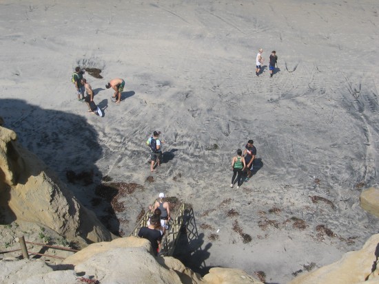 Erosion of layered sandstone creates unusual, fluid forms.Flat Rock can be seen below on Torrey Pines State Beach.Steps head steeply down from cliffs.Hikers arrive at the beach!